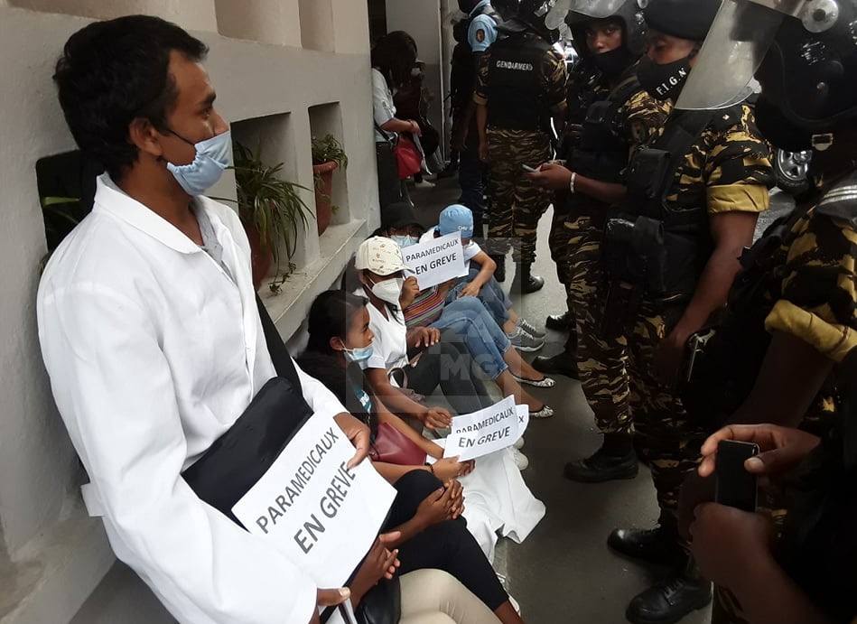 Antananarivo, 9 Février, 14h05 – Vêtus de blouse blanche et brandissant des écriteaux, des paramédicaux grévistes effectuent un sit-in devant le siège du ministère de la Santé publique ce mardi. La manifestation a commencé au moment où les responsables du ministère assistent à une cérémonie de remise de dons dans les locaux du ministère. Des éléments des forces de l’ordre sont venus sur place pour sécuriser les lieux, mais le sit-in se déroule dans le calme.