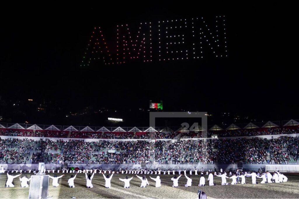 Entre sons et lumières. Les chants et les danses se sont élevés en prière dimanche après-midi au stade Barea Mahamasina. Des dizaines de milliers de personnes sont venues assister au concert de louange devenu traditionnel de la veille de la fête de l’Indépendance. Le président de la République Andry Rajoelina et son fils cadet, ainsi que plusieurs membres du gouvernement, tous vêtus de blanc, ont aussi été présents au concert destiné à demander la bénédiction divine pour le pays. Une artiste évangélique internationale Dena Mwana figure parmi les artistes venus animer le show. Le concert qui a duré presque cinq heures s’est clôturé par un spectacle de drone et de feux d’artifice après la prière de bénédiction donnée par des pasteurs en toge blanche.