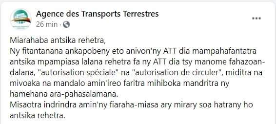 Antananarivo, 19 Avril, 17h10 – L’Agence des transports terrestres (ATT) se veut ferme. Dans un communiqué publié sur sa page Facebook, le bureau dirigé par le général Jeannot Reribake « informe tous les usagers de la route que la direction générale de l’ATT ne donnera, durant l’état d’urgence sanitaire, aucune autorisation, que ce soit une autorisation spéciale ou une autorisation de circuler, pour entrer dans les zones en quarantaine, pour en sortir ou pour y passer ».