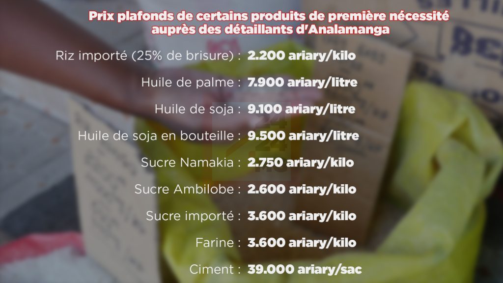 Riz importé : 2.200 ariary/kilo Huile de palme : 7.900 ariary/litre Huile de soja : 9.100 ariary/litre Huile de soja en bouteille : 9.500 ariary/litre Sucre Namakia : 2.750 ariary/kilo Sucre Ambilobe : 2.600 ariary/kilo Sucre importé : 3.600 ariary/kilo Farine : 3.600 ariary/kilo Ciment : 39.000 ariary/sac