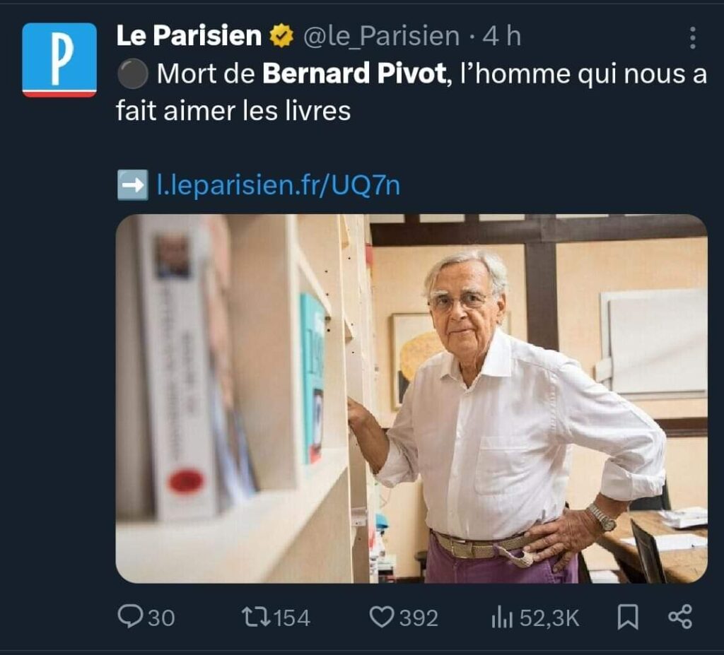 Antananarivo, 6 Mai, 19h15 – Une grande figure de la télévision française s’est éteinte. Le journaliste Bernard Pivot, animateur de la célèbre émission littéraire »Apostrophes » diffusée sur Antenne 2, la chaîne publique française, est mort à 89 ans, ce lundi. Il est, pour de nombreux Français, celui qui, durant des années, leur avait apporté des écrivains, des livres, du bonheur à domicile.