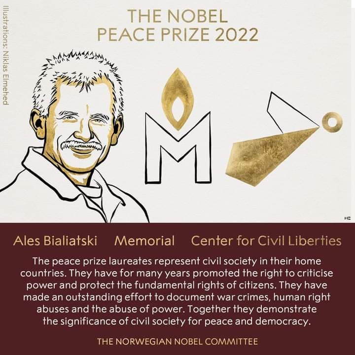 DISTINCTION – Le prix Nobel de la paix attribué au Biélorusse Ales Bialiatski, à l’organisation de défense des droits de l’homme russe « Memorial » et au centre pour les libertés civiles ukrainien