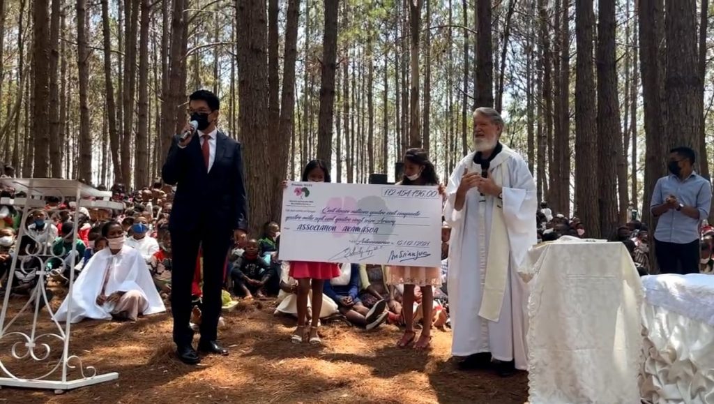Antananarivo, 25 Décembre, 11h40 – Un joyeux Noël à Andralanitra. Les pensionnaires et les bénéficiaires du centre Akamasoa ont reçu, non seulement des friandises pour les fêtes, mais aussi un don de plus de 112 millions d’ariary pour les soutenir. Le président de la République a remis ce samedi de Noël au père Pedro un chèque provenant de la vente du Covid organics sous son format décoction. « Nous nous sommes mis d’accord avec l’Imra (Institut malgache des recherches appliquées) qu’une partie des bénéfices des ventes serait offerte à Akamasoa », indique le président de la République en marge de la messe de Noël.