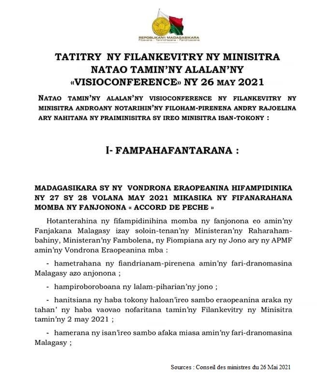 L’idée, souligne le compte-rendu du Conseil des ministres de mercredi, c’est « d’affirmer la souveraineté nationale sur les zones maritimes où les pêches sont autorisées ». Et cela passe, comme le souligne le communiqué du gouvernement par la « révision du montant des redevances comme cela a été décidé lors du Conseil des ministres du 2 Mai » et par la « limitation du nombre de bateaux de pêche autorisés à opérer dans les zones maritimes malgaches ».