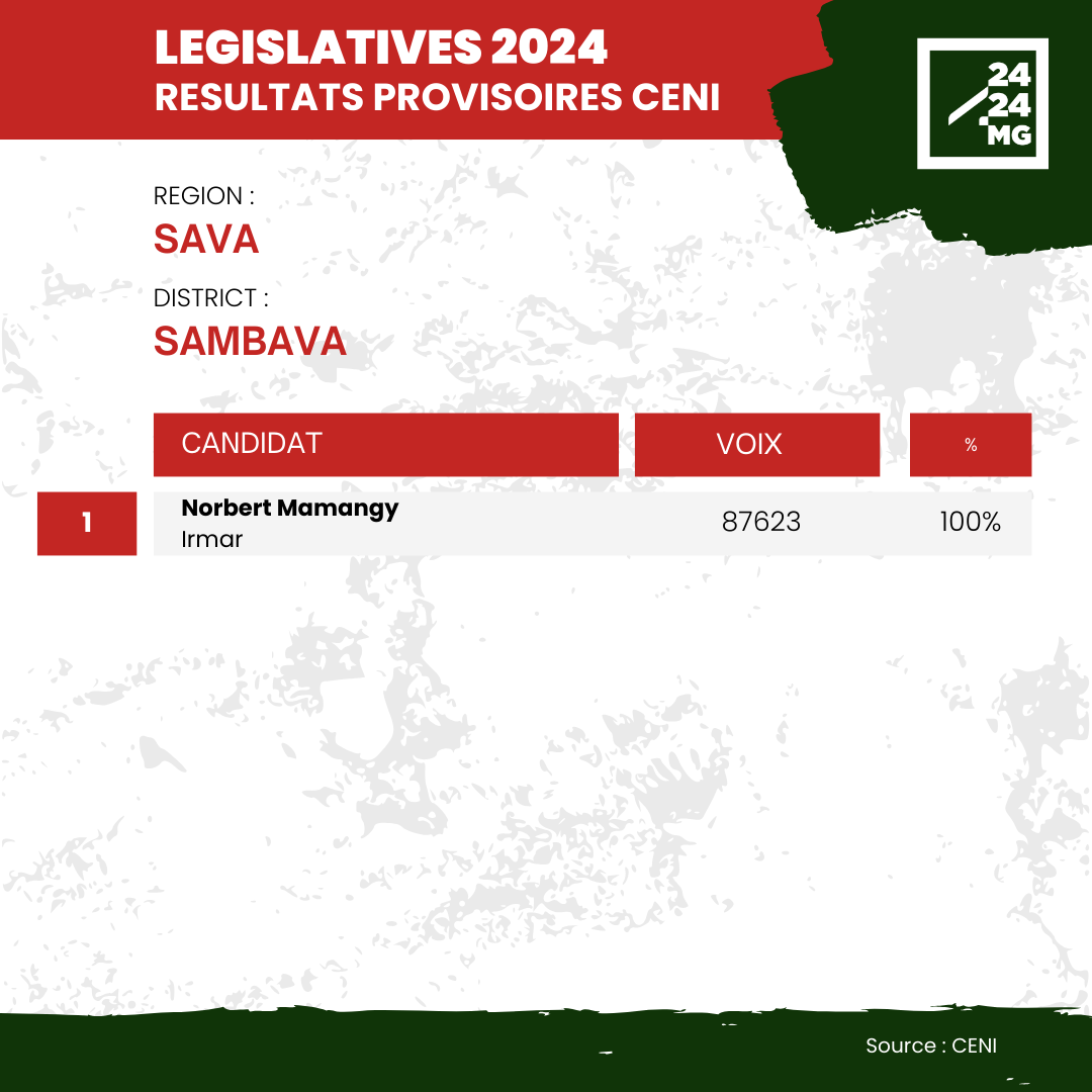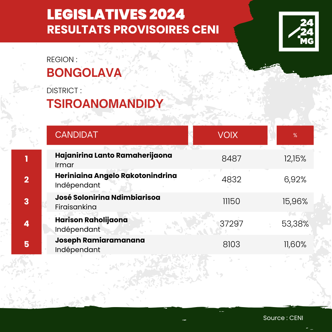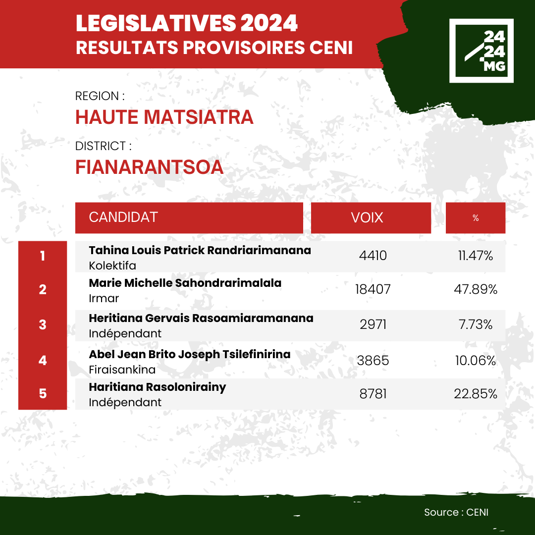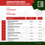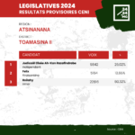 Le district d’Ihosy pourrait aussi attribuer deux députés à l’Irmar avec les 46,70% obtenus par la liste conduite par Bismarck Mong Mann et seulement 23,10% à la liste Firaisankina de Louis Joseph Rakotoarimavo arrivée deuxième. A Toamasina II, enfin, les deux sièges pourraient être Irmar après que la liste dirigée par Roilahy a obtenu 60,32% des voix alors que la liste arrivée deuxième, celle de l’indépendant Judicael Elisée Ah-Kan Razafindrabe a eu 26,02%.