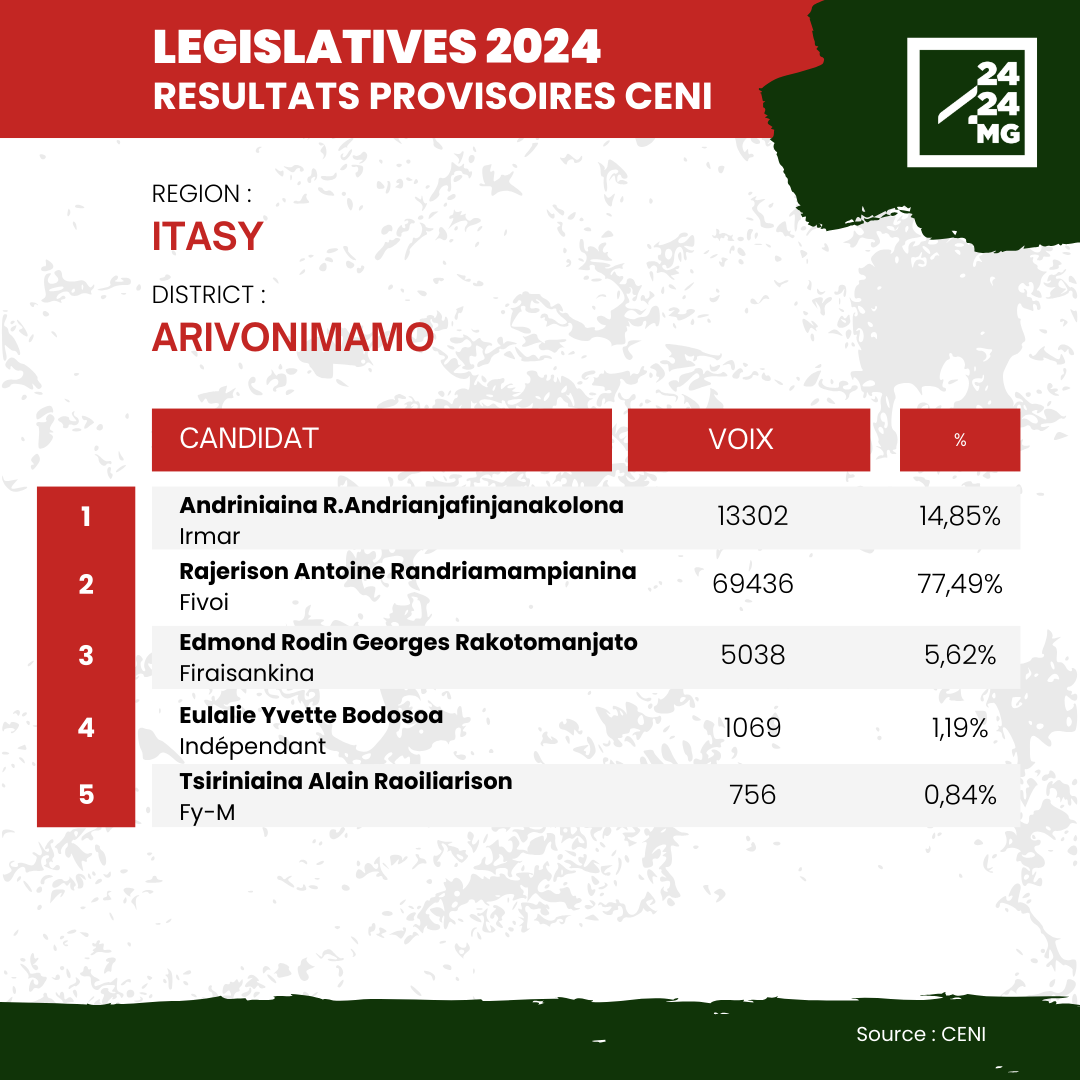 L’organisation Fivoi pourrait aussi avoir fait le pao-droa à Arivonimamo avec la liste de Rajerison Antoine Randriamampianina qui devance de très loin son poursuivant avec 77,49%. La liste Irmar conduite par Andriniaina Rakotondravoavy Andrianjafinjanakolona est deuxième mais avec 14,85% des suffrages.