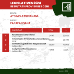 A Tsiroanomandidy, la liste indépendante de Harson Raholijaona sur laquelle figure l’ancien ministre de l’Agriculture et de l’élevage Lucien Ranarivelo, devrait aussi faire du “pao-droa” en gagnant la course avec 53,38%, devant la plateforme Firaisankina qui a obtenu 15,85%. La liste indépendante conduite par Raby Savatsarah Ain’Harimanga, secrétaire générale démissionnaire du ministère de la Justice, pourrait aussi remporter les deux sièges à pourvoir à Farafangana avec ses 49,90%. La liste de plateforme Irmar dirigée par Velomihoatra Andrianambenana, qui arrive deuxième, pour sa part, a obtenu 23,48% des suffrages.