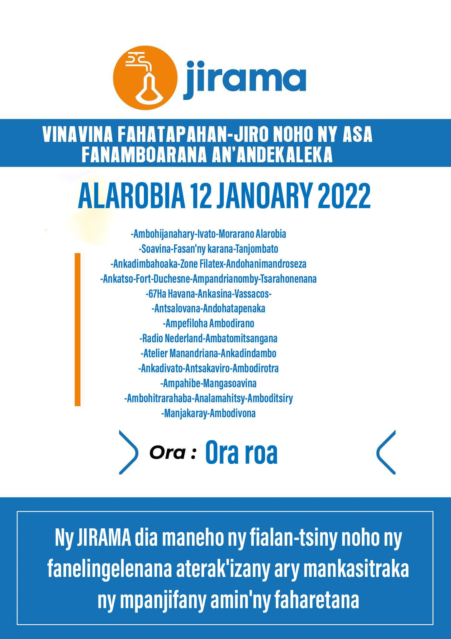 Antananarivo, 12 Janvier, 11h42 – Les longues coupures d’électricité surviennent même en pleine journée sur le réseau interconnecté d’Antananarivo (RIA). Depuis deux jours, la Jirama n’attend plus la fin de l’après-midi pour annoncer le délestage. L’annonce d’une coupure intervient avant midi et l’heure à laquelle elle intervient n’est plus indiquée. Les visuels publiés par la compagnie sur sa page Facebook indiquent les quartiers qui subiront la coupure et en précisent la durée.