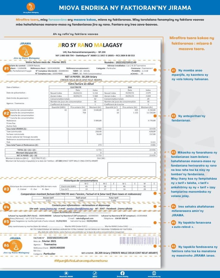 Par contre, les abonnés devraient avoir, à partir de l’émission de la facture nouveau format, une idée de ce que sera le montant de leur facture lorsque le nouveau tarif s’appliquera en Juillet. Ils auront donc trois mois pour se préparer à une éventuelle hausse s’ils font partie des « gros consommateurs » et ajuster ainsi leur consommation. Des publications de la Jirama indiquent déjà aux consommateurs comment mieux gérer et mieux consommer l’électricité.