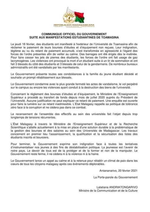 Jeudi, des étudiants de l’Université de Toamasina sont descendus dans la rue pour réclamer le paiement quatre mois de bourses d’études et de l’allocation d’équipements, et « non d’un seul mois parce que cela fait quatre mois que la rentrée a eu lieu », soutiennent-ils. La manifestation a dégénéré et s’est soldée par la mort d’un manifestant. Celui-ci avait été tué à cause d’une balle provenant « d’un tir de sommation d’un gendarme encerclé par les étudiants » au cours de la manifestation, selon la version des autorités.