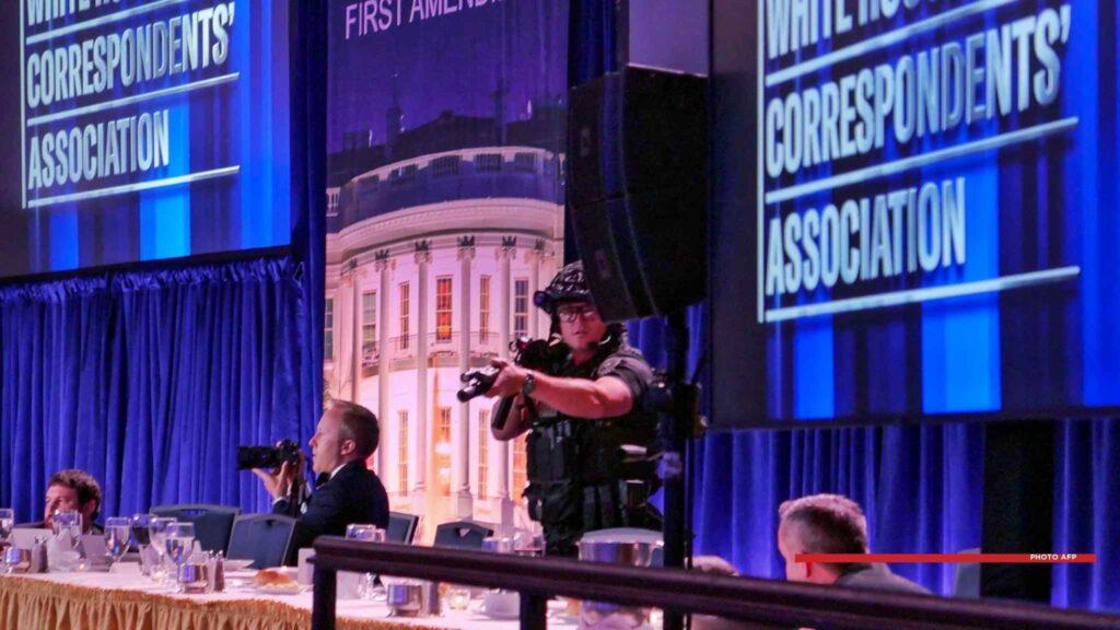 Le dîner annuel de l’association des correspondants à la Maison Blanche avait débuté depuis peu, selon les journalistes de l’AFP présents, quand une grande agitation s’est fait entendre aux portes de la salle. Des cris de « A terre! A terre! » ont retenti. Les convives se sont immédiatement allongés ou agenouillés par terre, beaucoup d’entre eux brandissant leurs téléphones pour filmer.