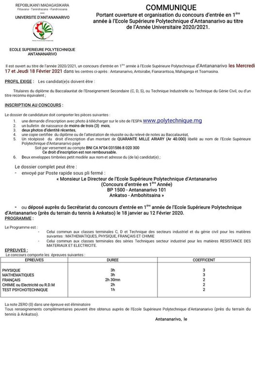 Antananarivo, 7 Janvier, 15h10 – Les bacheliers de 2020 doivent enfin se préparer à la prochaine rentrée universitaire. Ceux qui souhaitent intégrer l’École supérieure polytechnique d’Antananarivo (Espa) peuvent dès maintenant constituer leur dossier.