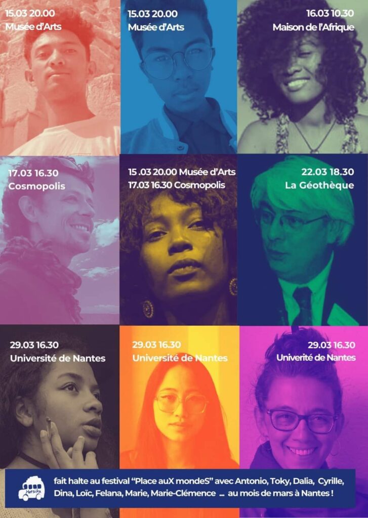 Parmi les divers événements, on retiendra l’ouverture du festival « Place Aux Mondes », le 15 mars, avec une performance danse et chant avec les traceurs Faliniaina Antonio, Toky Ranaivomanana ainsi que la chanteuse Dina Mialinelina, dans une soirée au Musée d’arts de Nantes, en collaboration avec la compagnie Yvann Alexandre.
