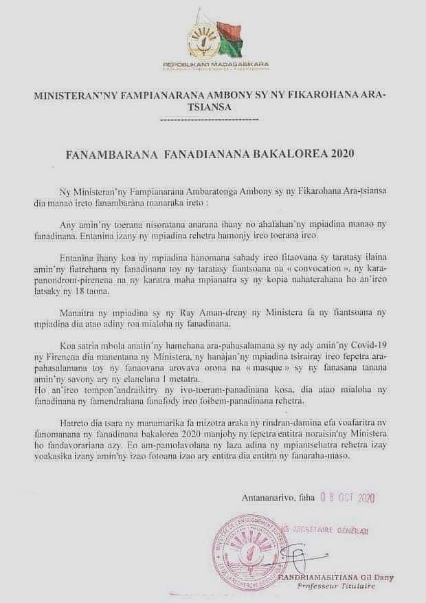Antananarivo, 9 Octobre, 8h00 – Pas d’exception ni de dérogation pour les candidats au baccalauréat. « Les candidats au baccalauréat ne doivent passer les examens qu’auprès des centres où ils se sont inscrits », indique le ministère de l’Enseignement supérieur et de la recherche scientifique dans un communiqué. Tous ceux qui vont passer les épreuves à partir du 19 Octobre sont donc « invités à rejoindre les localités où ils se sont inscrits », souligne le ministère.