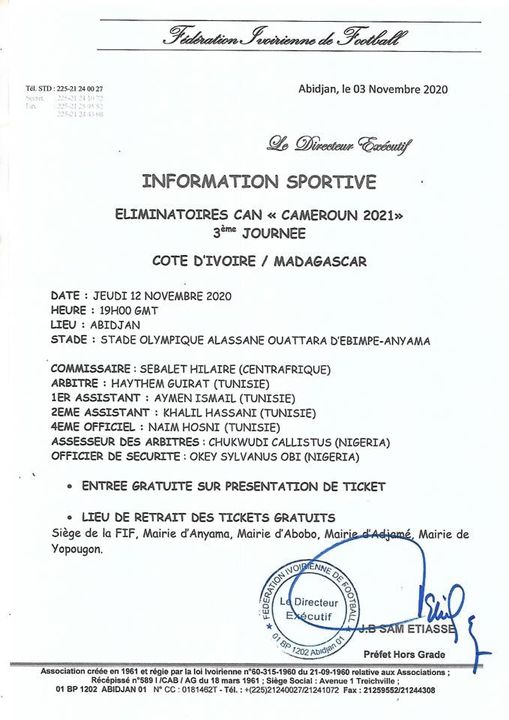 ⭕️Selon l’information sportive signée du directeur exécutif de la FIF, le match devrait se dérouler au stade olympique Alassane Ouattara d’Ebimpe-Anyama le 12 Novembre à 19h GMT. L’entrée est « gratuite sur présentation de ticket », indique l’annonce qui cite cinq sites pour le retrait des tickets gratuits.