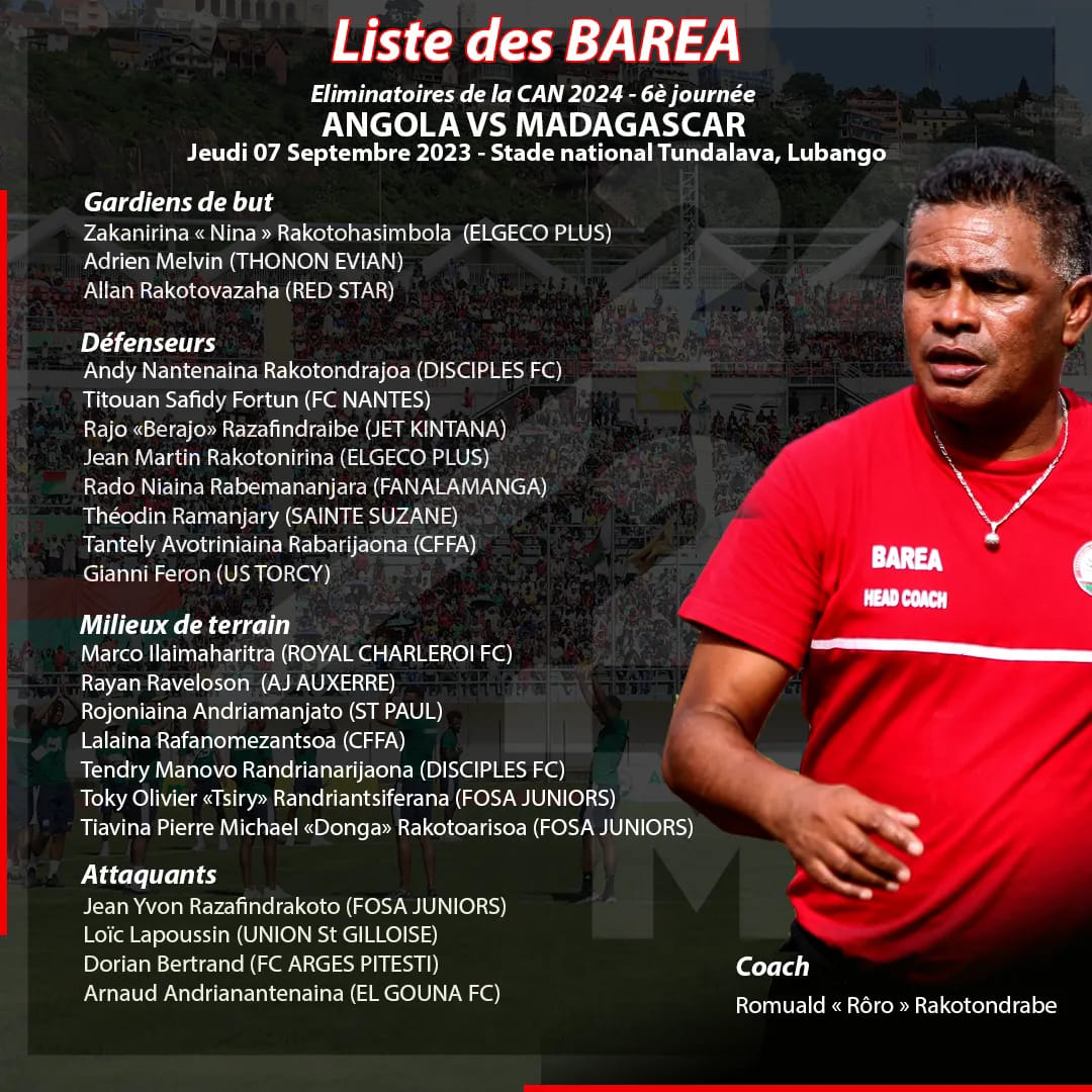 ⭕Le sélectionneur Romuald « Rôrô » Rakotondrabe convoque onze expatriés pour la rencontre. C’est, le cas des milieux de terrain Marco Ilaimaharitra (Charleroi) et Rayan Raveloson (AJ Auxerre), de l’ailier Loïc Lapoussin (Union Saint Gilloise) ou encore de l’attaquant Arnaud Andrianantenaina (FC Gouna) en Egypte.