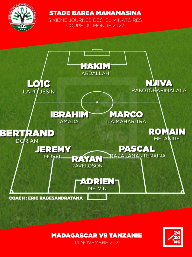 Antananarivo, 14 Novembre, 15h32 – Éric Rabesandratana, le sélectionneur des Barea, apporte peu de changements pour débuter face aux Taifa Stars de la Tanzanie, à Mahamasina ce dimanche. Il reconduit Melvin Adrien au poste de gardien de but. Le schéma 3-4-3 se muant en 5-4-1 est maintenu.