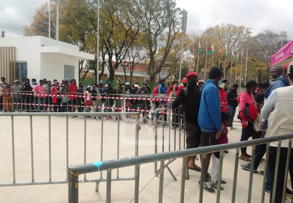 Les organisateurs avaient misé sur la présence de 20 000 personnes pour le double événement. La distribution des tickets a commencé en fin de matinée. Certaines personnes sont venues à Mahamasina depuis vendredi soir pour pouvoir obtenir le ticket d’entrée. L’espoir de pouvoir infléchir la CAF et sa décision d’un match à huis clos est perceptible chez les gens autour du stade rénové.