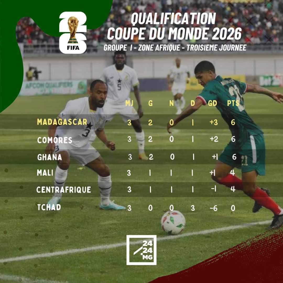 A part le Tchad, décroché, les cinq équipes du groupe se trouvent dans un mouchoir de poche où tout peut basculer à chaque journée. Trois équipes sont créditées de six points et la Grande île tient sa première place grâce à la différence de buts (+3). Les Comores reculent d’une place et se trouvent à la seconde place avec six points (+2), tandis que le Ghana se replace après sa victoire contre le Mali (+1). Le Mali, prochain adversaire de Madagascar, se trouve à la quatrième place, avec seulement deux points de moins que les Barea.