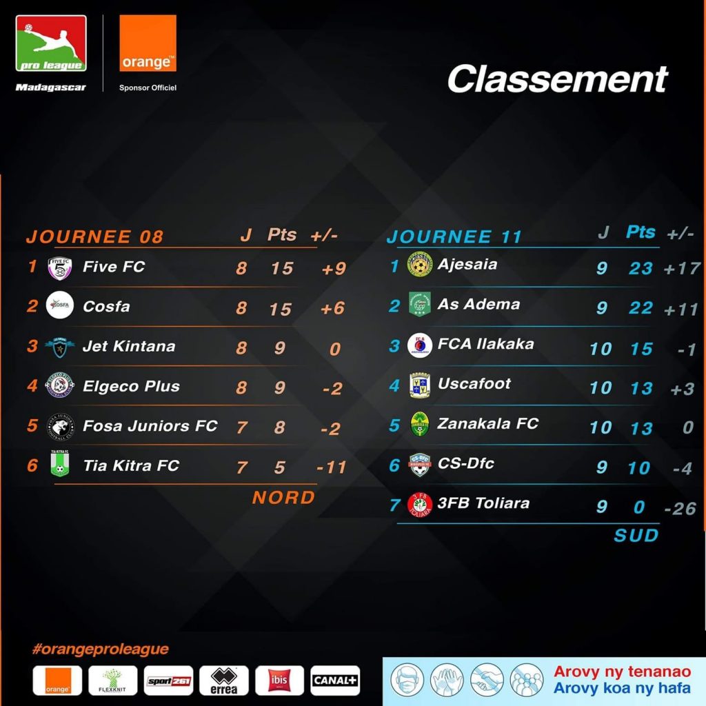 FOOTBALL/PRO LEAGUE – L’Ajesaia et l’As Adema qualifiées pour les playoffs dans la conférence Sud, le Five FC et le Cosfa toujours leaders de la conférence Nord