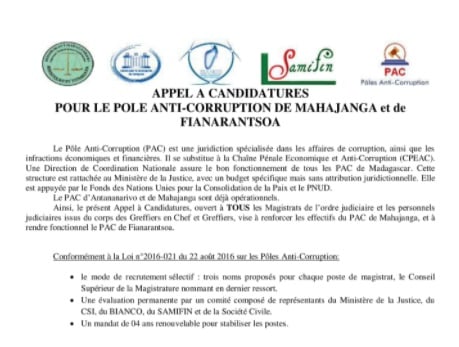Antananarivo, 19 Novembre, 22h20 – Après Antananarivo et Mahajanga, c’est à Fianarantsoa que le prochain pôle anti-corruption (PAC) se met en place. Un appel à candidatures publié ce jeudi par le ministère de la Justice appelle les magistrats et les greffiers à postuler à diverses responsabilités pour « rendre fonctionnel » le PAC de Fianarantsoa.