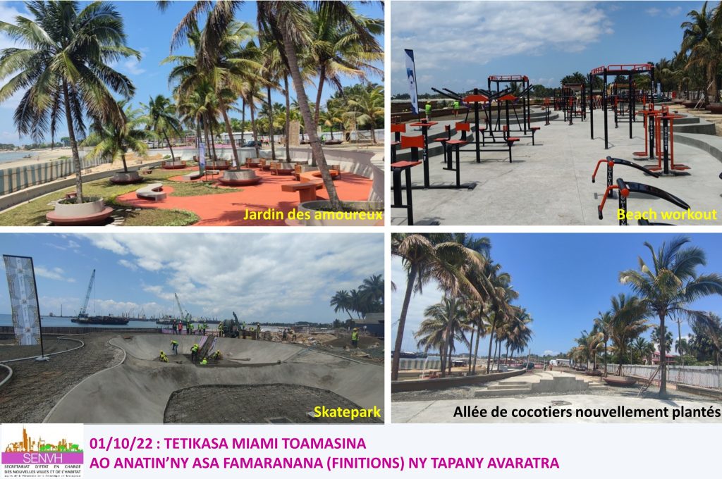 Antananarivo, 3 Octobre, 15h30 – « Toamasina s’impatiente, même ceux qui n’ont pas cru à la réalisation du projet ». A en croire le secrétariat d’Etat en charge des Nouvelles villes et de l’habitat, les travaux d’aménagement de la partie Nord du projet Miami à Toamasina sont en cours de finition. « Une visite de travail a été effectuée sur place par le président de la République avec le SENVH pour constater l’avancement de la finalisation des travaux et pour donner les consignes liées aux travaux de finition », communique le ministère sur sa page Facebook.