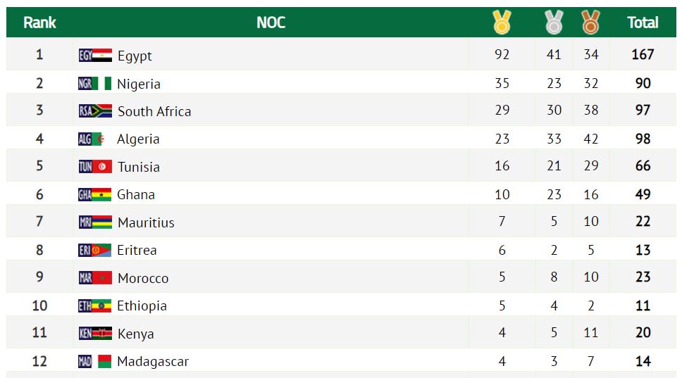 Madagascar compte dans son escarcelle 14 médailles, dont quatre en or, trois en argent et sept en bronze. Le Kenya à qui ses athlètes a remporté trois médailles d’or et une médaille d’argent en marche et en course de fond, totalise 20 médailles dont quatre en or, cinq en argent et 11 en bronze. Le Kenya passe donc à la 11ème place devant Madagascar. L’Ethiopie reste 10ème avec cinq médailles d’or et quatre en argent. Le Maroc, neuvième, a cinq en or et huit en argent.