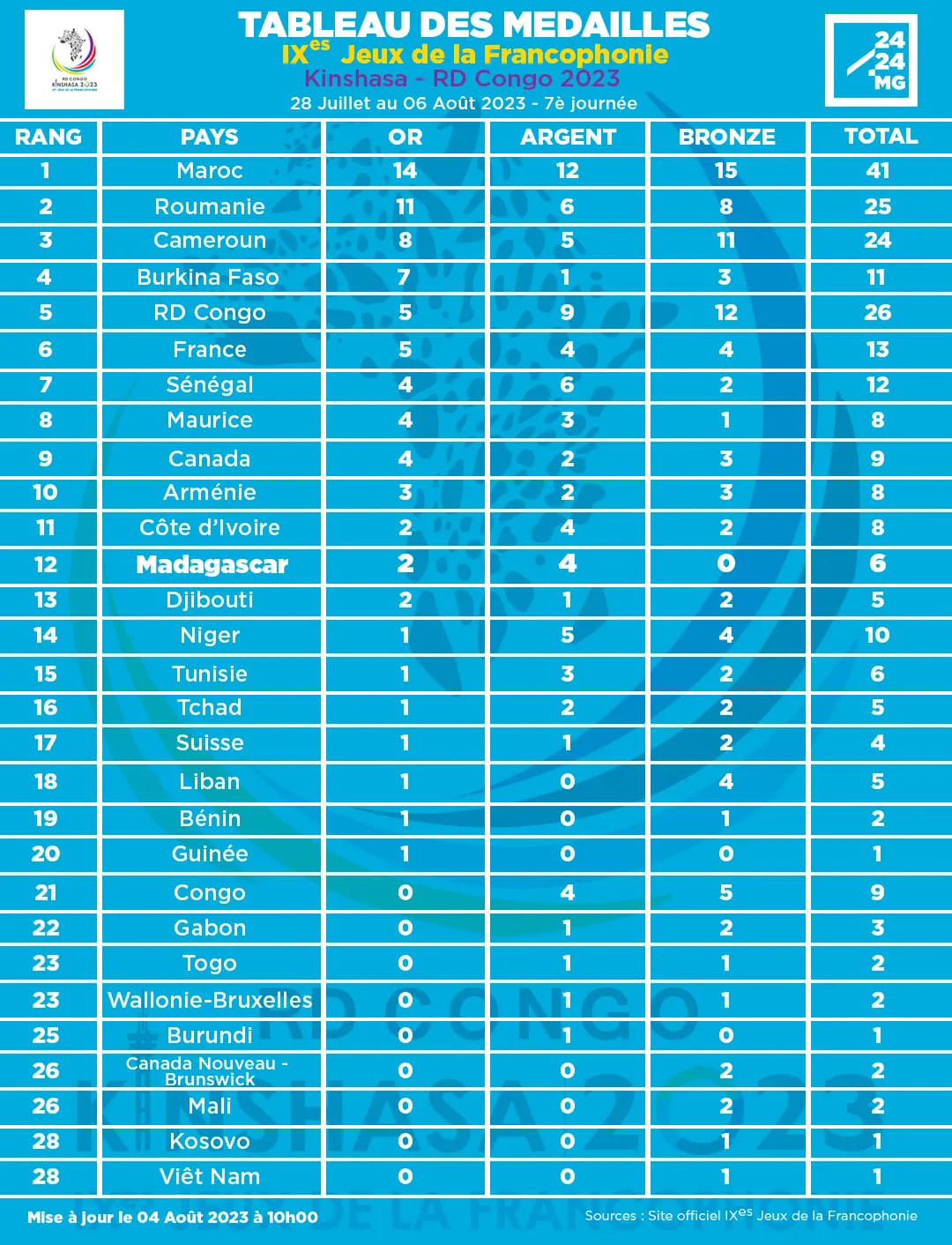 Les trois premières places au classement des médaille sont occupées par le Maroc, la Roumanie et le Cameroun. Le Maroc avec 14 médailles d’or, 12 en argent et 15 en bronze est premier. La Roumanie est deuxième avec 11 médailles d’or, six en argent et huit en bronze. Le Cameroun, troisième, a dans son escarcelle huit breloques en or, cinq en argent et 11 en bronze. L’île Maurice occupe la 8ème place avec quatre médailles d’or, trois en argent et une en bronze.