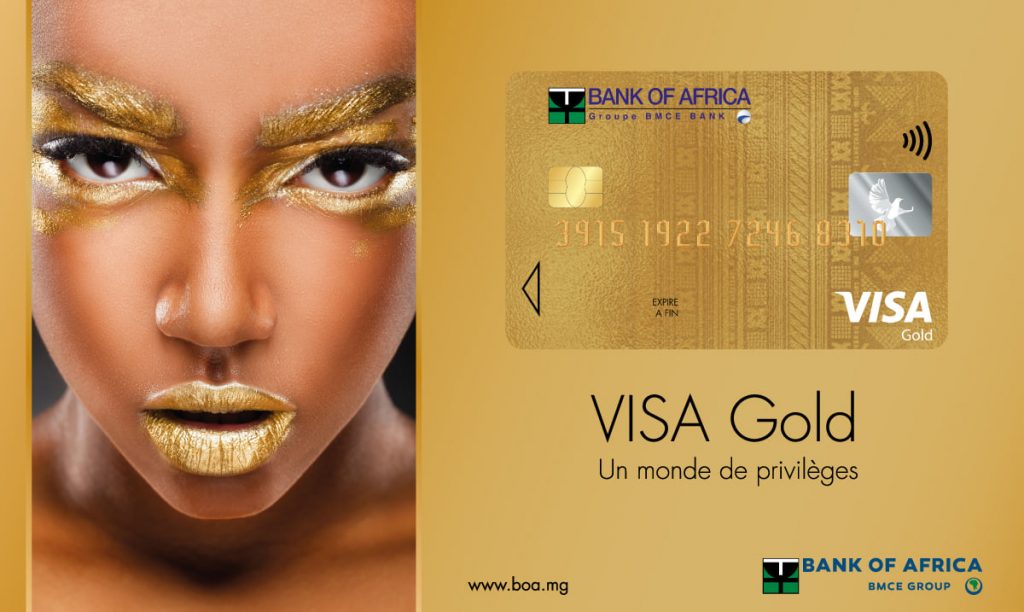 La carte haut de gamme GOLD de BOA Madagascar vous offre des privilèges à la clientèle Elite tels le paiement sans contact, le paiement et retrait dans tous le réseau VISA, le paiement en ligne avec sécurité renforcée. Le client reçoit un SMS après chaque opération. Découvrez cette nouvelle offre en appelant gratuitement les numéros 032 23 817 77/033 65 817 77/034 30 817 77 ou envoyant un mail à boa@boa.mg ou en visitant https://www.boa.mg