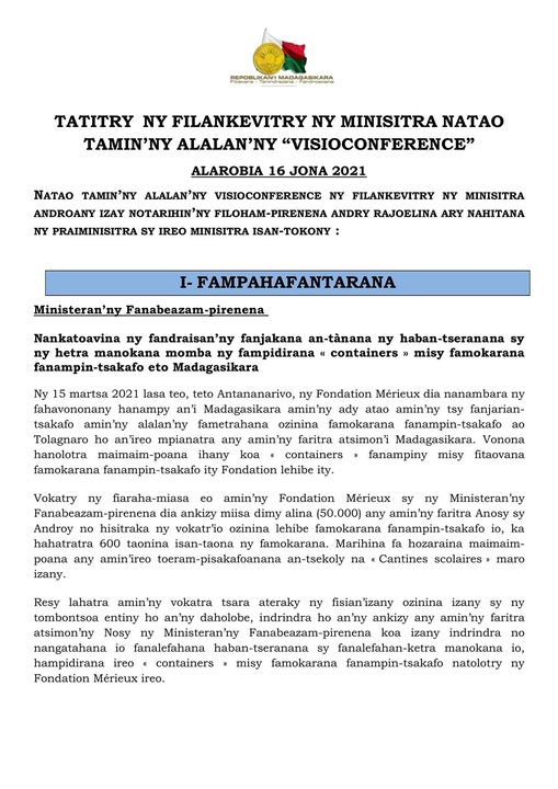 ⭕Cette usine, qui sera implantée à Tolagnaro, devrait fabriquer 600 tonnes de compléments alimentaires par an, indique le communiqué du Conseil des ministres. Ces produits devraient ensuite bénéficier à 50.000 enfants dans les établissements scolaires d’Androy et d’Anosy, dans le cadre d’un partenariat entre la Fondation Mérieux et le ministère de l’Education nationale.