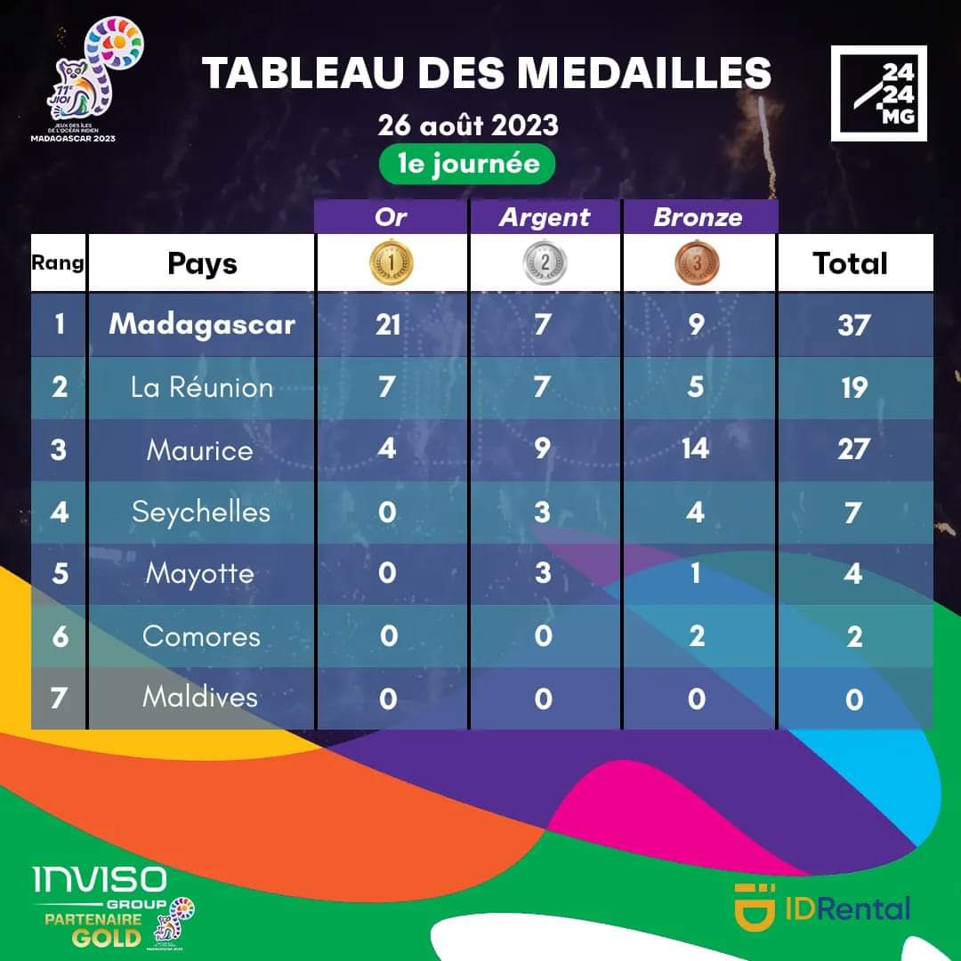 Sur le tableau des médailles, La Réunion est deuxième à l’issue de la première journée avec sept médailles d’or, sept médailles d’argent et cinq médailles de bronze. Vient ensuite l’île Maurice avec ses quatre médailles de d’or, neuf médailles d’argent et 14 médailles de bronze. Les Seychelles, avec trois médailles d’argent et quatre médailles de bronze est quatrième, tandis que Mayotte, avec trois breloques en argent et une en bronze se retrouve à la cinquième place. Les Comores, avec deux médailles de bronze, est sixième. Les Maldives, elles, n’ont pas encore ouvert le compteur des médailles.