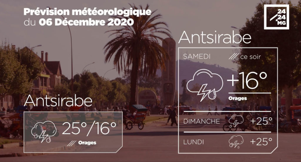 METEO du 06 décémbre 2020 par 2424.mg Actualité & Reportages 5 ans avant Partager sur FacebookPartager sur Twitter Les prévisions météorologiques des grandes villes de Madagascar pour la journée du 06 décémbre. Categories: Météo Tags: Météo Contenu Similaire CATASTROPHE NATURELLE - Alerte verte pour Ampanihy, Beloha et Tsihombe sous la menace des vents et fortes pluies liés à Gezani par 2424.mg Actualité & Reportages 14 février 2026 Cyclone Gezani : La région d’Atsinanana dévastées à 80-90%, selon le BNGRC par 2424.mg Actualité & Reportages 11 février 2026 CATASTROPHE NATURELLE - Gezani annoncé aussi puissant que Geralda par 2424.mg Actualité & Reportages 10 février 2026 CATASTROPHES - Des rafales jusqu’à 250 km/h annoncées avec le cyclone tropical Gezani attendu ce mardi après-midi par 2424.mg Actualité & Reportages 10 février 2026 METEO - L’Est malgache placé en alerte jaune, Gezani poursuit son avancée vers la Grande île en s’intensifiant par 2424.mg Actualité & Reportages 9 février 2026