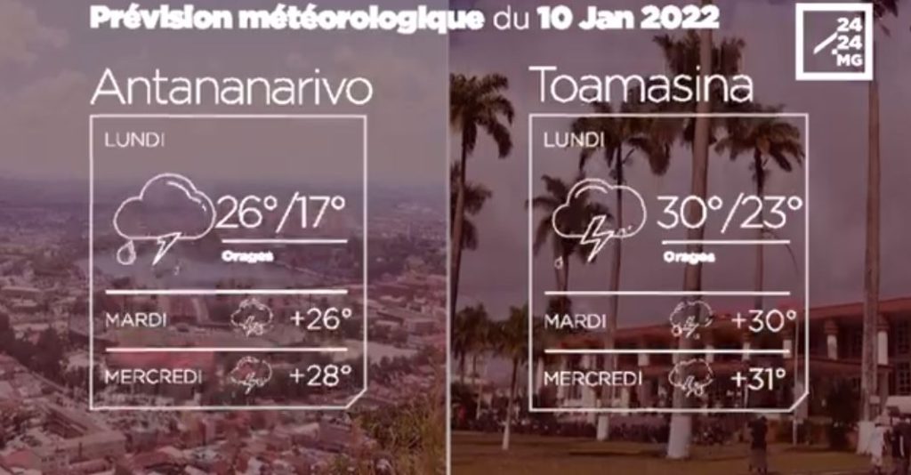 METEO du 10 janvier 2022 par 2424.mg Actualité & Reportages 4 ans avant Partager sur FacebookPartager sur Twitter Les prévisions météorologiques des grandes villes de Madagascar pour la journée du 10 janvier. Categories: Météo Tags: Météo Contenu Similaire CATASTROPHE NATURELLE - Alerte verte pour Ampanihy, Beloha et Tsihombe sous la menace des vents et fortes pluies liés à Gezani par 2424.mg Actualité & Reportages 14 février 2026 Cyclone Gezani : La région d’Atsinanana dévastées à 80-90%, selon le BNGRC par 2424.mg Actualité & Reportages 11 février 2026 CATASTROPHE NATURELLE - Gezani annoncé aussi puissant que Geralda par 2424.mg Actualité & Reportages 10 février 2026 CATASTROPHES - Des rafales jusqu’à 250 km/h annoncées avec le cyclone tropical Gezani attendu ce mardi après-midi par 2424.mg Actualité & Reportages 10 février 2026 METEO - L’Est malgache placé en alerte jaune, Gezani poursuit son avancée vers la Grande île en s’intensifiant par 2424.mg Actualité & Reportages 9 février 2026