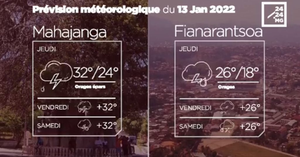 METEO du 13 janvier 2022 par 2424.mg Actualité & Reportages 4 ans avant Partager sur FacebookPartager sur Twitter Les prévisions météorologiques des grandes villes de Madagascar pour la journée du 13 janvier. Categories: Météo Tags: Météo Contenu Similaire CATASTROPHE NATURELLE - Alerte verte pour Ampanihy, Beloha et Tsihombe sous la menace des vents et fortes pluies liés à Gezani par 2424.mg Actualité & Reportages 14 février 2026 Cyclone Gezani : La région d’Atsinanana dévastées à 80-90%, selon le BNGRC par 2424.mg Actualité & Reportages 11 février 2026 CATASTROPHE NATURELLE - Gezani annoncé aussi puissant que Geralda par 2424.mg Actualité & Reportages 10 février 2026 CATASTROPHES - Des rafales jusqu’à 250 km/h annoncées avec le cyclone tropical Gezani attendu ce mardi après-midi par 2424.mg Actualité & Reportages 10 février 2026 METEO - L’Est malgache placé en alerte jaune, Gezani poursuit son avancée vers la Grande île en s’intensifiant par 2424.mg Actualité & Reportages 9 février 2026