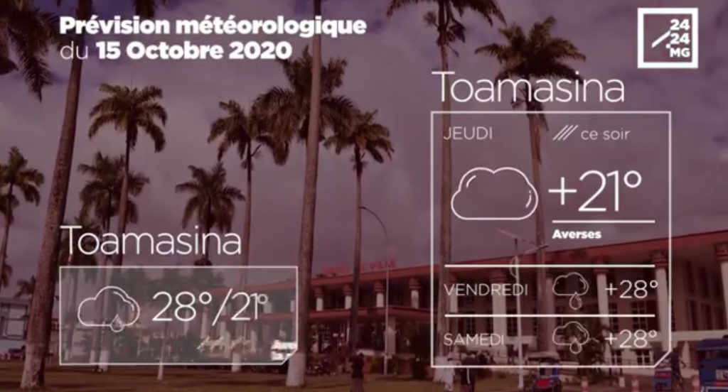 METEO du 15 octobre 2020 par 2424.mg Actualité & Reportages 6 ans avant Partager sur FacebookPartager sur Twitter Les prévisions météorologiques des grandes villes de Madagascar pour la journée du 15 octobre. Categories: Météo Tags: Météo Contenu Similaire CATASTROPHE NATURELLE - Alerte verte pour Ampanihy, Beloha et Tsihombe sous la menace des vents et fortes pluies liés à Gezani par 2424.mg Actualité & Reportages 14 février 2026 Cyclone Gezani : La région d’Atsinanana dévastées à 80-90%, selon le BNGRC par 2424.mg Actualité & Reportages 11 février 2026 CATASTROPHE NATURELLE - Gezani annoncé aussi puissant que Geralda par 2424.mg Actualité & Reportages 10 février 2026 CATASTROPHES - Des rafales jusqu’à 250 km/h annoncées avec le cyclone tropical Gezani attendu ce mardi après-midi par 2424.mg Actualité & Reportages 10 février 2026 METEO - L’Est malgache placé en alerte jaune, Gezani poursuit son avancée vers la Grande île en s’intensifiant par 2424.mg Actualité & Reportages 9 février 2026