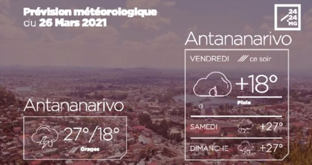METEO du 26 mars 2021 par 2424.mg Actualité & Reportages 5 ans avant Partager sur FacebookPartager sur Twitter Les prévisions météorologiques des grandes villes de Madagascar pour la journée du 26 mars. Categories: Météo Tags: Météo Contenu Similaire CATASTROPHE NATURELLE - Alerte verte pour Ampanihy, Beloha et Tsihombe sous la menace des vents et fortes pluies liés à Gezani par 2424.mg Actualité & Reportages 14 février 2026 Cyclone Gezani : La région d’Atsinanana dévastées à 80-90%, selon le BNGRC par 2424.mg Actualité & Reportages 11 février 2026 CATASTROPHE NATURELLE - Gezani annoncé aussi puissant que Geralda par 2424.mg Actualité & Reportages 10 février 2026 CATASTROPHES - Des rafales jusqu’à 250 km/h annoncées avec le cyclone tropical Gezani attendu ce mardi après-midi par 2424.mg Actualité & Reportages 10 février 2026 METEO - L’Est malgache placé en alerte jaune, Gezani poursuit son avancée vers la Grande île en s’intensifiant par 2424.mg Actualité & Reportages 9 février 2026