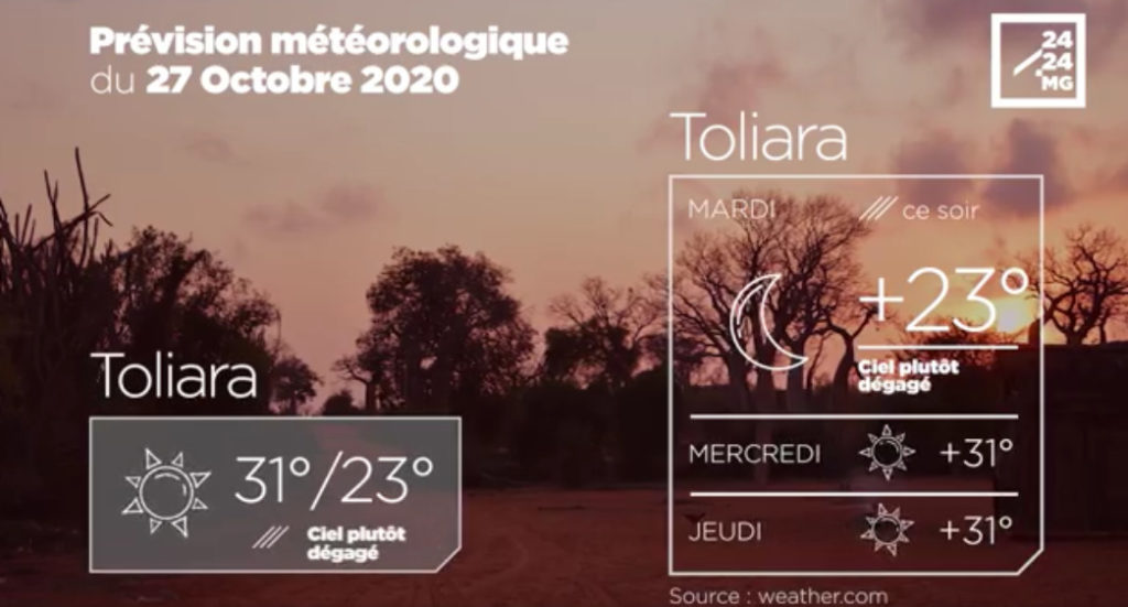 METEO du 27 octobre 2020 par 2424.mg Actualité & Reportages 6 ans avant Partager sur FacebookPartager sur Twitter Les prévisions météorologiques des grandes villes de Madagascar pour la journée du 27 octobre. Categories: Météo Tags: Météo Contenu Similaire CATASTROPHE NATURELLE - Alerte verte pour Ampanihy, Beloha et Tsihombe sous la menace des vents et fortes pluies liés à Gezani par 2424.mg Actualité & Reportages 14 février 2026 Cyclone Gezani : La région d’Atsinanana dévastées à 80-90%, selon le BNGRC par 2424.mg Actualité & Reportages 11 février 2026 CATASTROPHE NATURELLE - Gezani annoncé aussi puissant que Geralda par 2424.mg Actualité & Reportages 10 février 2026 CATASTROPHES - Des rafales jusqu’à 250 km/h annoncées avec le cyclone tropical Gezani attendu ce mardi après-midi par 2424.mg Actualité & Reportages 10 février 2026 METEO - L’Est malgache placé en alerte jaune, Gezani poursuit son avancée vers la Grande île en s’intensifiant par 2424.mg Actualité & Reportages 9 février 2026