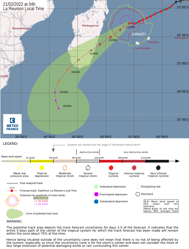 Antananarivo, 21 Février, 6h25 – Météo France Réunion indique qu’Emnati est déclassé temporairement au stade de cyclone tropical. L’intensité des vents maximaux qu’elle emmenait sont passés à 155km ces dernières heures, alors qu’ils avaient déjà atteint 175km/h dimanche après-midi.
