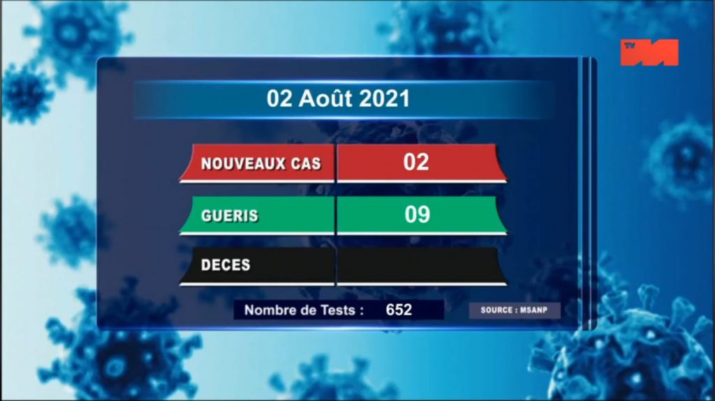 Aucun décès dû au coronavirus à la date du 2 Août, selon le rapport publié sur la chaîne de télévision publique ce mardi 3 Août 2021, par 2424.mg Actualité & Reportages 5 ans avant Partager sur FacebookPartager sur Twitter Le nombre total de décès dus à la Covid-19 à Madagascar depuis le début de l’épidémie reste à 947, Deux nouveaux cas confirmés positifs à la date du 2 Août 2021, tous dans le Vakinankaratra Parmi les patients en traitement, 31 présentent la forme grave de la maladie, Neuf patients sont annoncés guéris à la date du 2 Août, 652 tests ont été effectués, donnant un taux de positivité de 0,30%. Contenu Similaire SANTÉ PUBLIQUE –L’Etat accélère le déblocage du financement pour l’achat des vaccins de cette année par 2424.mg Actualité & Reportages 29 avril 2026 EXPLOITATION PÉTROLIÈRE - L’Omnis rappelle Madagascar Oil au respect strict du plan de développement de 2015 par 2424.mg Actualité & Reportages 29 avril 2026 JUSTICE – Le sort du président évincé Andry Rajoelina entre les mains de l’Assemblée nationale, selon Fanirisoa Ernaivo par 2424.mg Actualité & Reportages 29 avril 2026 MODERNISATION DE L’ETAT - 14 institutions déjà interconnectées via le système d’échange national et extension vers des secteurs vitaux en perspective par 2424.mg Actualité & Reportages 29 avril 2026 RESSOURCES HUMAINES – Les risques psychosociaux se présente comme l’un des défis les plus préoccupants dans le milieu du travail à Madagascar et dans le monde par 2424.mg Actualité & Reportages 29 avril 2026