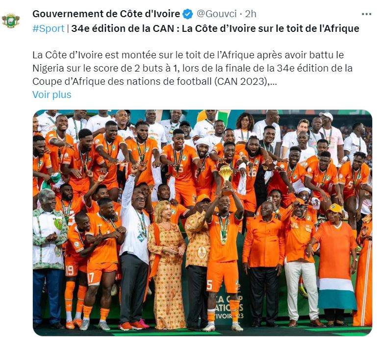 Antananarivo, 12 Février, 17h30 – Après le sacre des Eléphants de la Côte d’ivoire ce dimanche 11 Février, à l’issue de la finale de la Coupe d’Afrique des nations 2023 face au Nigéria, le président de la République ivoirien, Alassane Ouattara, décrète ce lundi, « férié chômé et payé » sur toute l’étendue du territoire national, à titre exceptionnel. Une journée pour fêter et célébrer la victoire des Eléphants. Cela faisait plus de 18 ans que la CAN n’avait pas été remporté à domicile. C’était l’Egypte qui avait remporté son dernier CAN à domicile en 2006. Cette victoire ivoirienne intervient plus de neuf ans après la victoire des Eléphants en 2015 en Guinée Equatoriale.