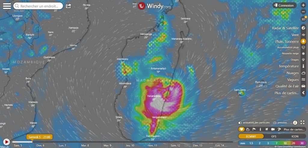 CATASTROPHES – Le cyclone tropical intense Batsirai touche terre à 20h à 14km au Nord de Mananjary avec des vents de 165km/h et des rafales de 230km/h, selon Météo Madagascar