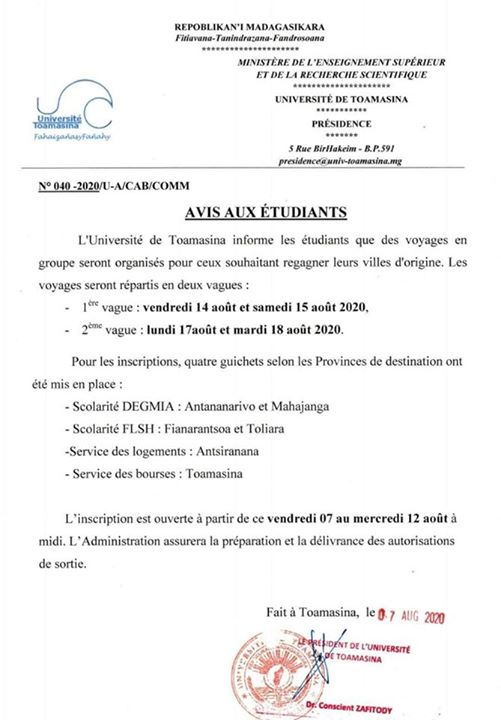 Antananarivo, 8 Août, 10h27 – Des étudiants de l’Université de Toamasina pourront peut-être rentrer chez eux. Dans un avis publié sur sa page Facebook, l’Université de Toamasina annonce l’organisation de « voyages en groupe pour ceux qui souhaitent regagner leurs villes d’origine ».