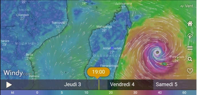 A 15h ce jeudi, Batsirai se trouvait à 671 km à l’Est de Vatomandry. Il emmenait dans son sillage des vents moyens de 165km/h et des rafales allant jusqu’à 235km/h. Il poursuivait son cap vers l’Ouest Sud Ouest mais à une vitesse plutôt lente, 7km/h, par rapport à sa vitesse quand il se trouvait un peu plus loin des côtes.