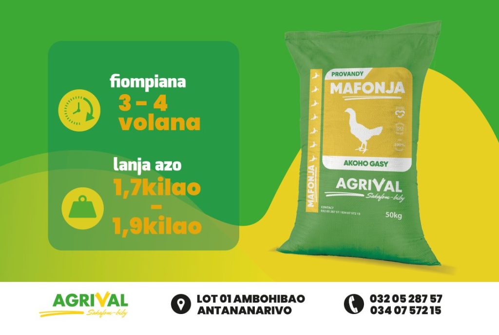 Ny provandy ho an’ny AKOHO GASY vokarin’ny orinasa AGRIVAL dia hitanao eny amin’ny mpanjinjara akaiky anao rehetra. Ny fampiasana azy dia ahazoanao 1,9kg ao anatin’ny 4 volana ary feno ny singa rehetra ilaina amin’ny fitomboan’ny biby fiompinao