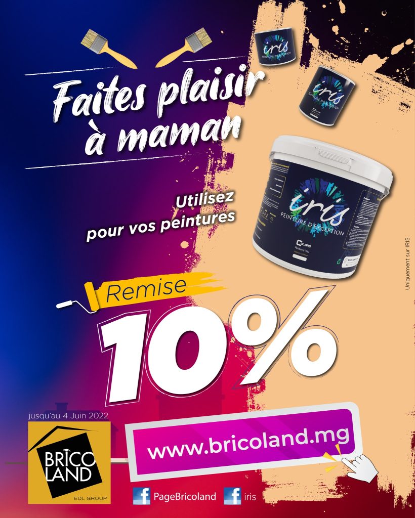 Jusqu’au 04 juin 2022, présentez ce visuel dans tous les magasins Bricoland pour bénéficier d’une remise de 10% sur la gamme Iris, peinture d’exception !