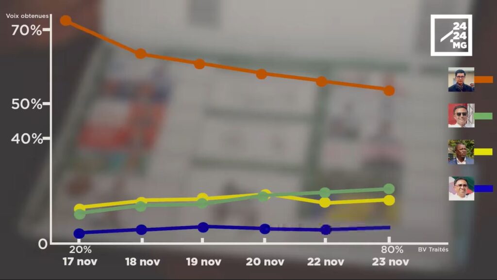 La Commission électorale nationale indépendante annonce avoir déjà dépouillé et enregistré les résultats issus de 21 670 bureaux de vote sur les 27 375, soit les 79,16 % qui ont été mis en place lors du scrutin du 16 Novembre. Il reste environ 20 % de bulletins à enregistrer, et la victoire du candidat Andry Rajoelina qui dispose jusqu’ici de 59,55% des suffrages exprimés semble acquise.