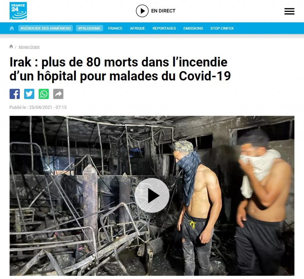 Trois jours de deuil national ont été déclarés par les autorités irakiennes et le ministre de la Santé publique a été suspendu suite à cet incendie. Avec plus de 500.000 cas cumulés de Covid-19 depuis le début de l’épidémie dans le pays en Février 2020, et 15.000 décès liés à la Covid-19, l’Irak est le pays arabe le plus touché par la pandémie du coronavirus.