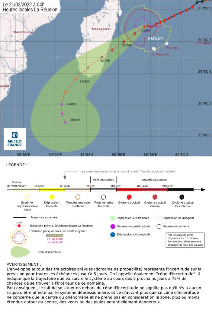Antananarivo, 21 Febroary, 6ora57 – Nidina ho rivodoza « cyclone tropical » vetivety i Emnati raha efa niakatra ho « cyclone tropical intense » na rivodoza mahery vaika, hoy Météo France Réunion. Nihena ho 155km/ora ny rivotra entiny tato anatin’ny ora vitsy raha toa ka efa nahatratra 175km/ora izany ny alahady tolakandro.