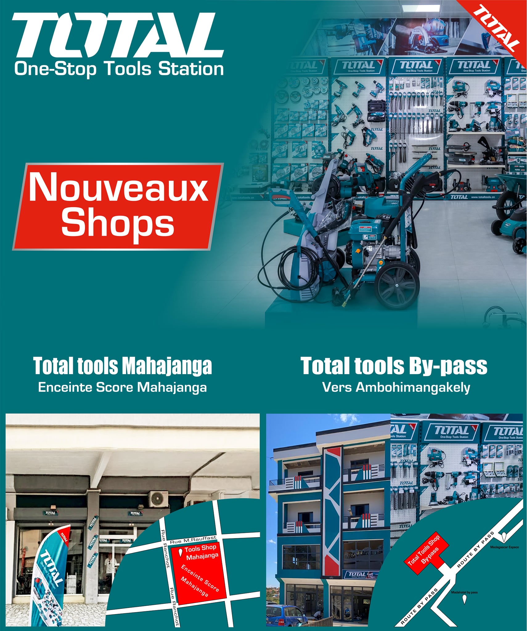 Total Tools étend son réseau de distribution et a récemment ouvert 3 magasins franchisés dont 2 à Antananarivo (Galerie commerciale du Centell Hôtel & SPA Antanimena ; By-pass, route vers Ambohimangakely) et un à Mahajanga (enceinte SCORE).