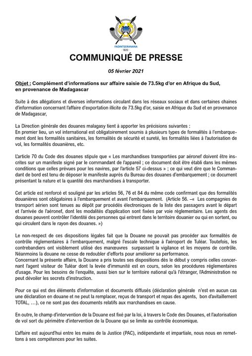 ⭕Le communiqué de la DGD rappelle, par ailleurs, que « la douane ne pouvait pas procéder aux formalités de contrôle réglementaires à l’embarquement, malgré l’escale technique à Ivato ». Elle explique qu’elle ne pouvait pas effectuer ce contrôle parce que le commandant de l’appareil n’aurait pas déposé le manifeste présentant la nature et la quantité des marchandises à transporter auprès du bureau des douanes d’embarquement, et parce que la compagnie n’aurait pas non plus déposer la liste des passagers avant le départ.